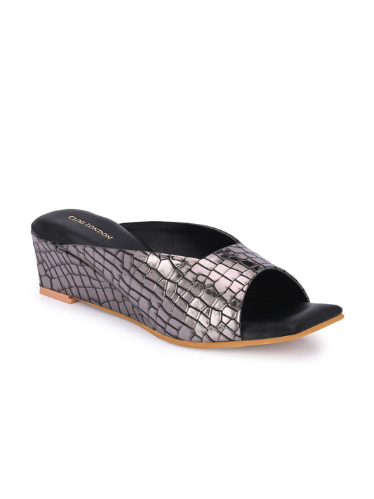 Women Grey Stylish Ethnic Wedge Flat Mules
